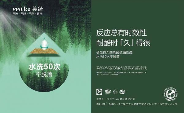耐酷时团队为美绮除醛窗帘抗菌墙布开发两项独有技术,粒子极限悬浮分散技术及无机复合技术,将耐酷时粒子牢牢地负载于除醛窗帘抗菌墙布表面,即使遇水也不团聚,不易脱落,保证其能效的长期性。