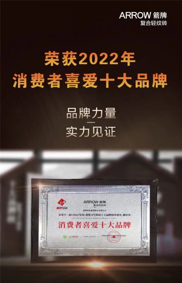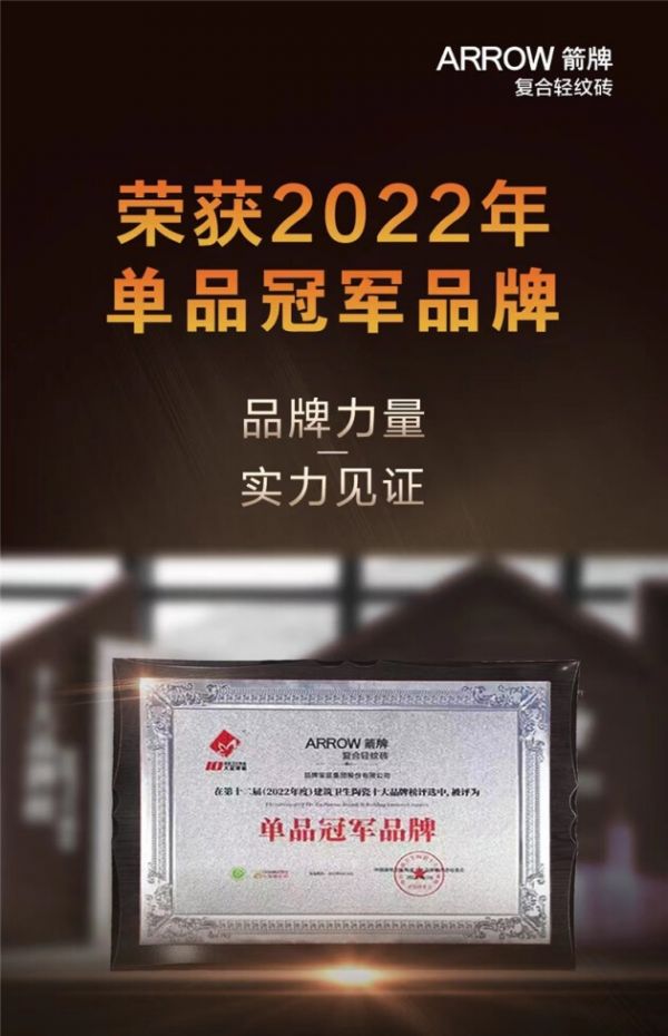 在此次评选中,箭牌复合轻纹砖不负众望,经过专业评委层层严格筛选,凭借雄厚的品牌实力和产品优势,获得协会评委会和广大消费者的认可和信赖,综合评价名列前茅,最终荣膺2022年度“瓷砖十大品牌”、“单品冠军品牌”和“消费者喜爱十大品牌”三项重量级大奖!