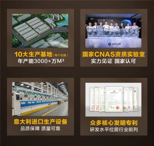 作为行业先锋榜样品牌,箭牌复合轻纹砖背靠箭牌家居集团,历经15年品牌沉淀,拥有国内一流的、先进的瓷砖生产线,年产量达3000+平方米,荣获多项研发专利和技术。