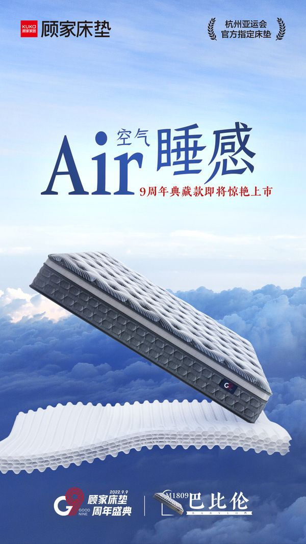 例如,顾家床垫9周年纪念款巴比伦床垫,引入空气芯结构,智适应身姿曲线,用深睡科技革芯,定义全新Air空气睡感。