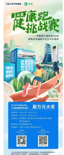 而在后疫情时代的当今,随着人们生活方式的悄然改变,“健康生活”正在成为人民关注的新中心。EBC英宝纯作为健康家电的新进品牌,紧贴趋势,开展全民健康跑活动,旨在引领社会健康跑新风气,鼓励更多民众参与到健康跑运动中。据了解,参与此次活动的民众,只需累计五天完成3公里跑步打卡,就可以参与到抽奖活动,赢取多重好礼,一等奖是能价值万元的“健康豪礼”EBC空气环境机HK5201。