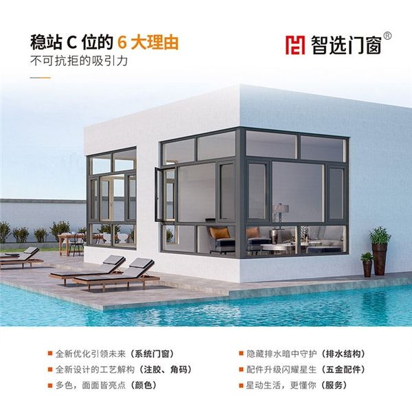 在《2021中国门窗行业发展趋势蓝皮书》中,专家经过深入市场调研后对于门窗产品结构分析在材质方面,铝合金门窗是目前使用最为广泛的门窗类型;在价格方面,消费者则倾向于更具性价比的中端价位门窗。在智选门窗目前拥有的产品中:推拉窗、平开窗、平开门、推拉门、阳光房、门套线等多个新款系列,外观均以“满足现代人士之个性化需求”为出发点,为消费者的使用更加安全,均很好地符合了目前中国门窗行业的发展趋势,也很好地符合消费者对于门窗的选择。智选门窗极力推荐的产品:星光A7断桥窗纱一体平开窗、星辉95 内开内倒窗纱一体窗、星辉125智能断桥平开窗、星爵X5断桥窗纱一体窗、星耀103双内开窗纱一体窗、荣耀V6断桥平开窗等。