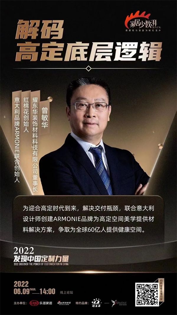 2022年6月,由新浪家居发起,耀东华特约赞助的「解码高定底层逻辑」线上论坛如期召开,新浪家居、耀东华集团曾敏华董事长、高定企业及产业链嘉宾一同就行业走向、核心突破点、高定的本质等问题展开探讨,共同促进高定行业的健康前行。