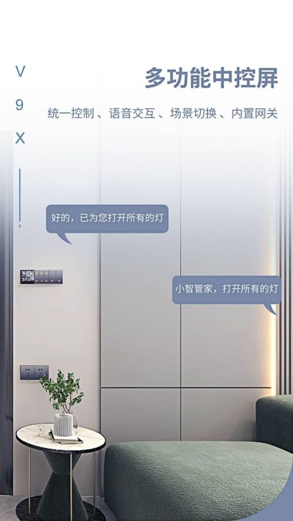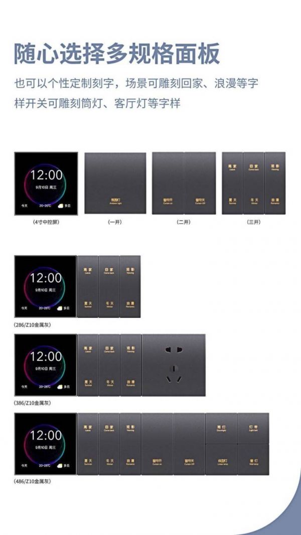面板分有V91系列智能联体金属灰,V92系列智能联体灰色(玻璃)。用户可根据需求在面板上也个性定制刻字,场景可雕刻回家、浪漫等字样,而开关可雕刻筒灯、客厅灯等字样。