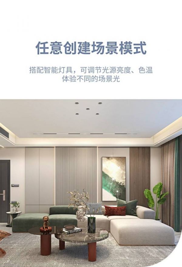 多种场景模式:(1)回家模式:照明与窗帘智能联动,即一键打开室内所有灯,同时智能窗帘自动拉开。(2)离家模式:一键关闭室内所有灯,同时智能窗帘自动闭合。(3)观影模式:开启低照度背景光,营造电影院的真实场景。(4)夏天模式:色温偏冷,显得清凉。(5)冬天模式:色温偏暖,让人体验到温暖的感觉。此外,还有会客、浪漫等多种模式可以自由创建。