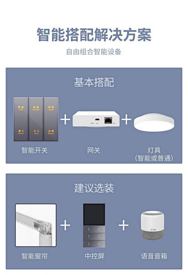 用户可根据实际需求搭配硬件。基本搭配:智能开关+网关+灯具(智能或普通);建议选装:智能窗帘、中控屏、语音音箱。