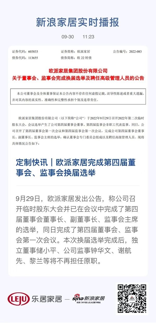 新浪定制频道讯 9月29日,欧派家居发出公告,称公司召开临时股东大会并已在会议中完成了第四届董事会董事长、副董事长、监事会主席的选举,同日完成了第四届董事会、监事会第一次会议。本次换届选举完成后,独立董事储小平、公司监事钟华文、谢航先、黎兰等将不再担任原职。