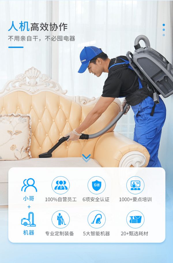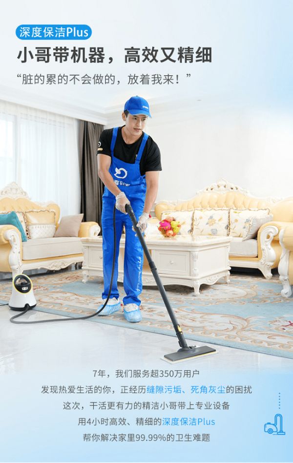 此次升级的【深度保洁Plus】,服务小哥均为受过专业培训干活更有力的精洁养护师,他们将带上专业的机器设备,人机结合,高效、精细地为用户解决家里99.99%的卫生难题。