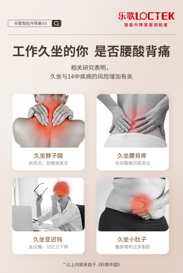 另有研究表明,长期久坐和不良坐姿还会诱发各种其他疾病。世界卫生组织数据显示,70%的疾病都由坐得太久引起,久坐因此被列为“十大致死、致病的杀手之一”。久坐伤身,已成为了共识。人们要改变这种现状,重新评估健康、舒适和便捷的重要性。“坐站交替”正在成为一种更健康的办公、学习、娱乐方式。
