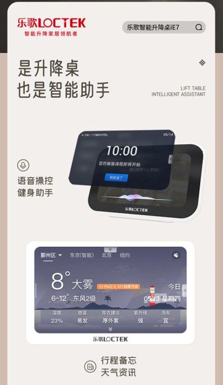 乐歌iE6智能升降桌搭载的AI智控秘书屏,轻松实现语音交互,彻底解放双手,通过语音交互控制和触控的方式来调节桌面高度。除此之外内置的行程备忘、天气资讯、休闲娱乐、航班查询等多项功能,成为家庭和工作中体贴周到的小秘书,让消费者感受到智能生活的精致与便捷。