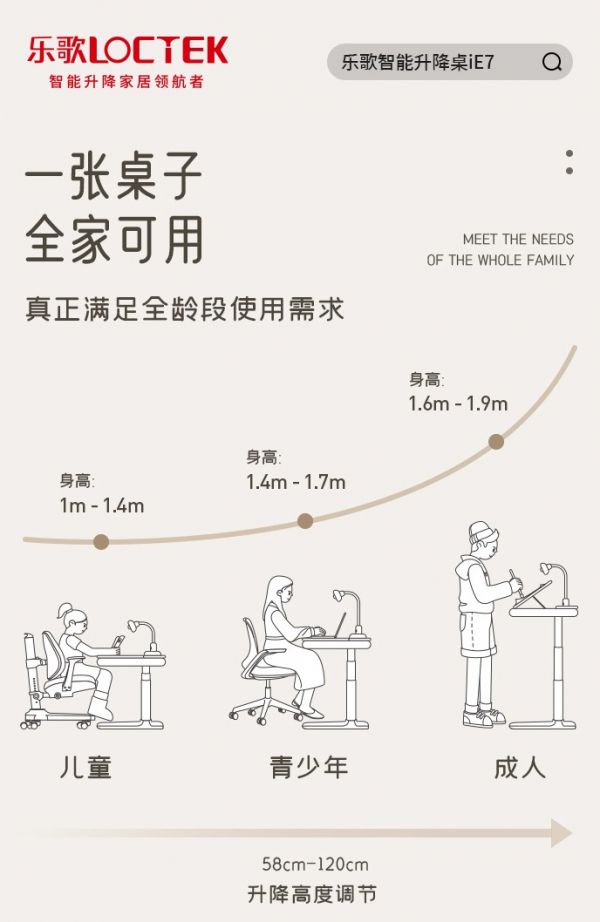 一桌多用,全家共享,乐歌智能升降桌60-125CM大范围升降区间,无论是4岁孩子或是身高1.9米的成年人都可以使用,满足全龄段使用需求。一张桌子,从少用到老,呵护全家脊椎健康。