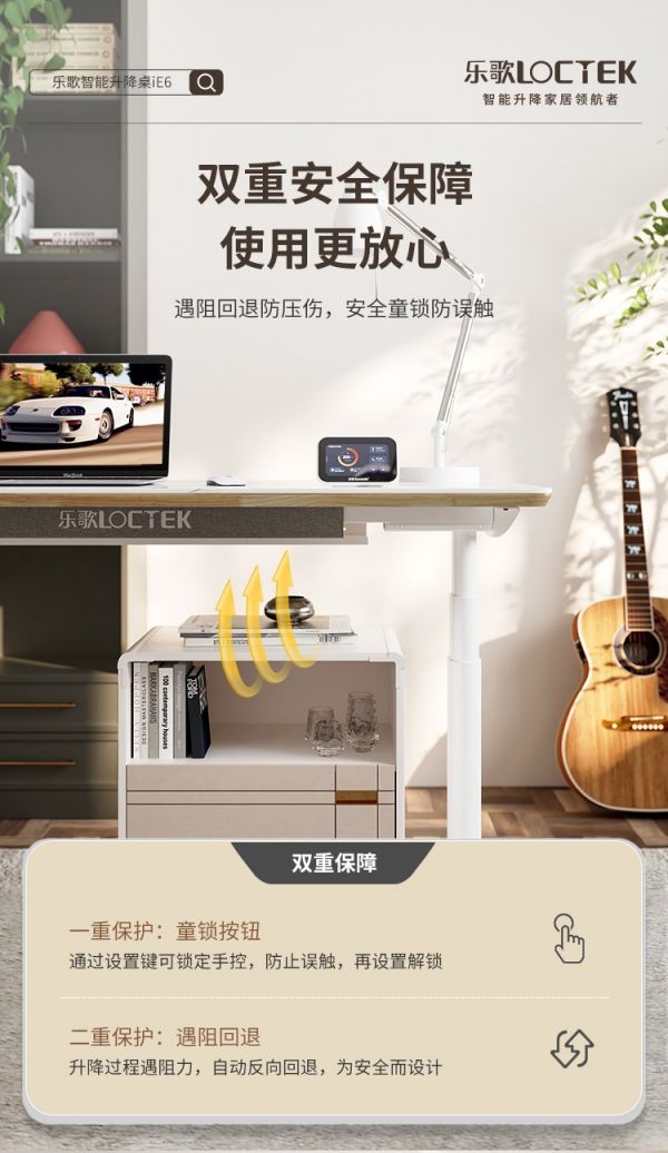 为保障用户使用安全,乐歌智能升降桌不仅配备了童锁,可以排除误触带来的安全隐患,并且还内置了传感器,当遇到物品阻碍或人为撞击时,升降桌会立即启动反向回弹机制,最大程度保障使用者的安全。