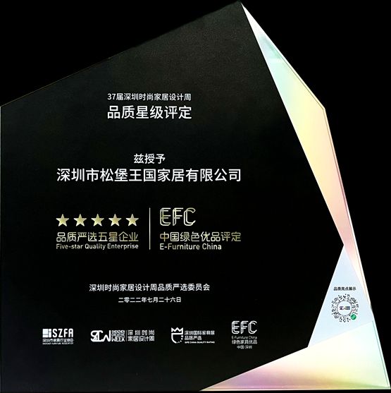 这么多年一路走来,连续6年获得深圳标准认证,该认证一定程度上高于国家标准认证,弥补了国家认证的缺漏,更加细致的呵护儿童健康成长生活。从家具界权威奖项金汐奖、金奖、银奖、铜奖的揽获,到EFC五星级品质“绿色家具优品”的认证,无不证明松堡王国在儿童家具所沉淀的实力与品牌公信力。