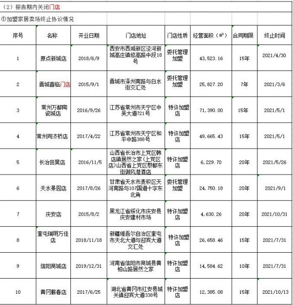 此外,居然之家也在2021年年报披露了闭店情况,在此期间共关闭了10家加盟家居卖场门店。