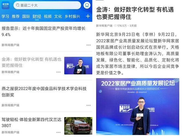 9月23日,2022家居产业高质量发展论坛暨新华网家居国民品牌成长计划启动仪式在京举行。论坛围绕“释放消费潜力、创造品质生活”主题,邀请工信部、家居协会等相关领导以及行业头部品牌代表,共商创新之策,共谋发展之路。作为实木地板品类代表,天格地暖实木地板受邀参会,并与专家一道研讨家居行业高质量发展路径。会议期间,天格董事长助理金涛于新华网媒体工厂,就地板行业高质发展接受采访。