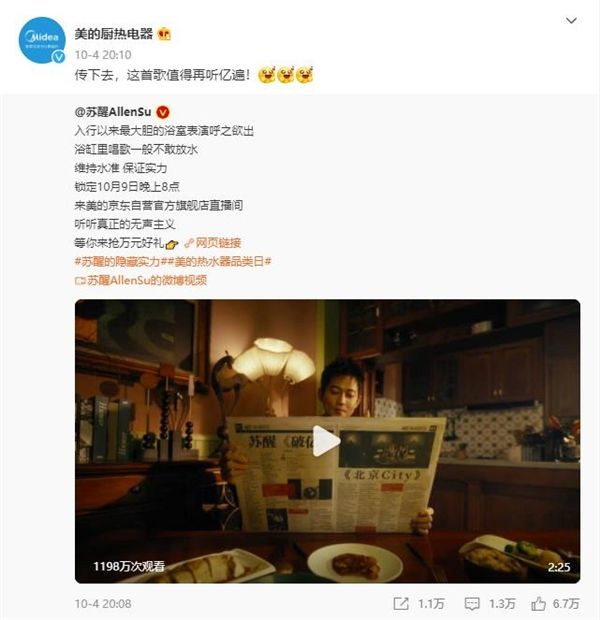 除了话题互动外,美的热水器还携手明星苏醒共同演绎《最佳“隐”帝》,通过说唱的方式,再现了用户生活沐浴中的烦恼,邀请网友一起解锁万有“隐”力,让美好苏醒!