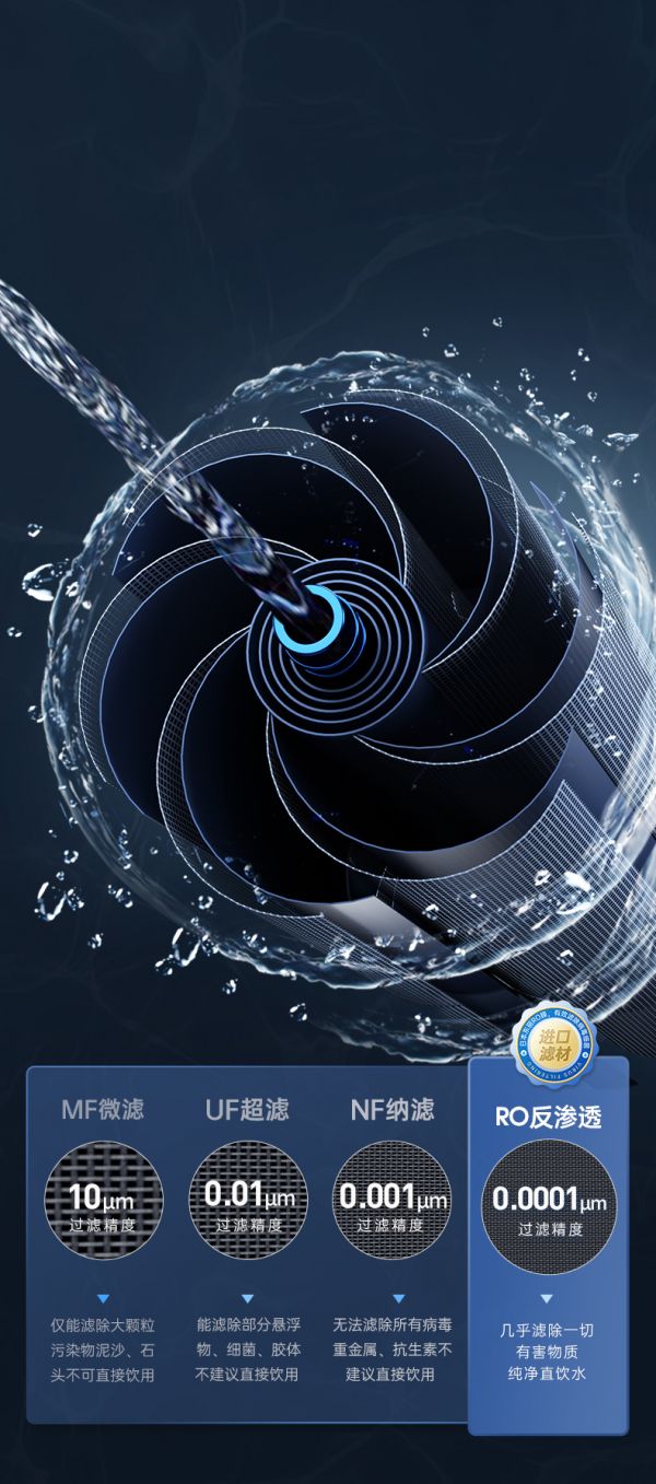摩飞即热净饮机创新净化技术,采用6in1RO复合滤芯,精选进口RO反渗透净化膜、ACF活性碳纤维、抑菌层、阻垢剂等优质滤材,1根滤芯即实现六重深层净化+强效抑菌,有效过滤自来水中的细菌、病毒、重金属、水垢、余氯、异味、胶体、铁锈等杂质,根据权威检测认证,其对病毒、农残、重金属去除率大于99.9%,对大肠杆菌去除率达100%,即滤即饮享安心,杯杯纯净直饮,助力生活品质进阶。