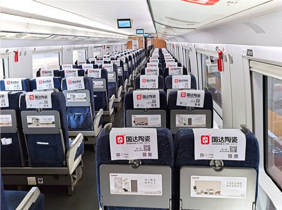 走进国达陶瓷高铁冠名列车,可以看到通过头片、桌贴、海报、品牌天幕、车外门贴、车身彩贴、播音LED等全媒体形式,“视觉+听觉”立体化传播,对消费人群实现了长时间、全方位、场景化的品牌信息输出,让民族品牌形象魅力和情感价值的同步传递,实现品牌价值的再度进阶,让国达陶瓷与业主的美好生活建立的连接更加紧密。