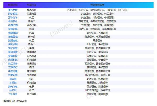随着“银十”的到来,各大券商10月份金股推荐名单和最新市场观点已经陆续出炉。通联数据Datayes!显示,截至目前,共有贵州茅台、海尔智家等23只股票被两家以上券商共同推荐,涉及食品饮料、家用电器、房地产等领域。