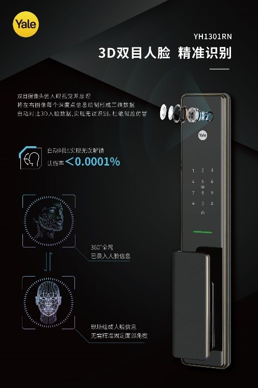 自智能锁面世以来,破解的手段层出不穷,比如复制指纹、打印人像照片欺骗智能锁等,难免让人们对智能锁抱有疑虑。作为行业引领者,耶鲁始终将安全视为重中之重。Yale耶鲁 YH1301RN创新使用3D双目人脸识别技术,双摄像头模拟人眼成像原理,将左右图像每个深度点信息绘制形成三维数据,自动对比每个深度点信息绘成的3D人脸数据,精准快速识别,其认假率小于0.0001%。其中大范围自动感应识别,无需精准站位,大人小孩都能轻松解锁。