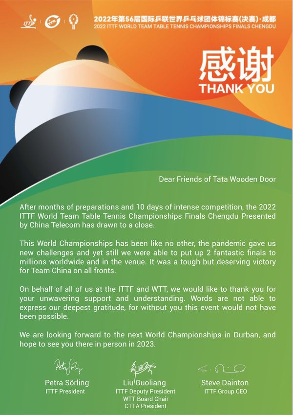 10月10日,国际乒联主席Petra Sorling、首席执行官Steve Dainton和第一副主席刘国梁在联合信中对TATA木门表示感谢。信中表示,国际乒联诚挚感谢TATA木门对本届世乒赛的支持,并期待2023年德班世乒赛再次与TATA木门携手。
