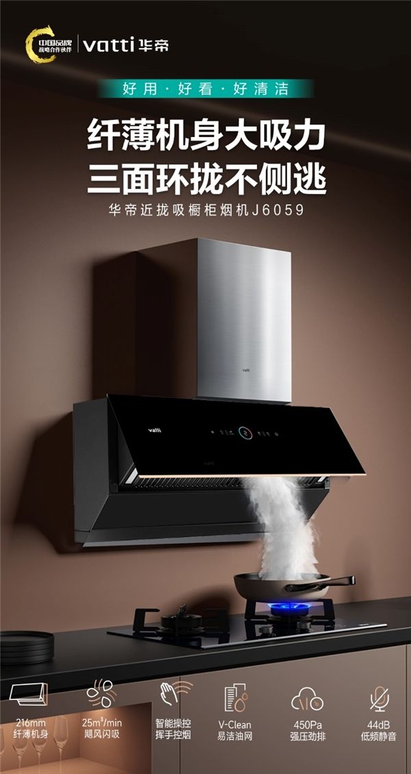 华帝烟机J6059:纤薄机身大吸力 三面环拢不逃烟