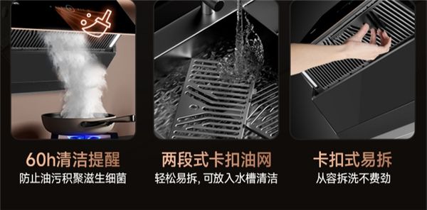 V-Clean易洁系统加持下,J6059的易洁度也得到了极大的提升:烟机油网表面采用新一代纳米涂层技术,油污不易沾附,只要轻轻一擦就能带走污渍;使用满60小时后,“清洁提醒”键长亮,自动提醒用户清洗保养烟机,防止油污、油垢长期滋生细菌,保持烟机的大吸力;两段式卡扣设计的油网相比传统烟机的油网而言,无论是拆洗还是安装都更加方便,小尺寸放进水槽清洗也不费力。