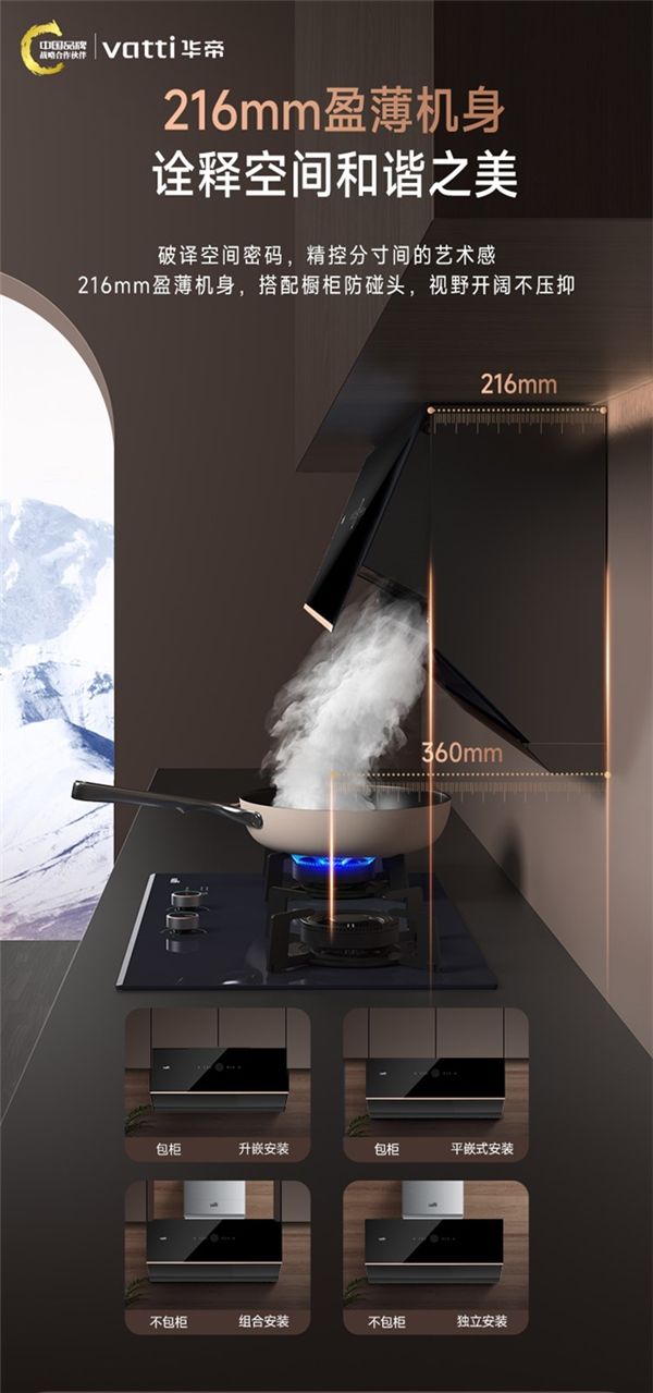 和华帝近拢吸橱柜系列烟机的其他产品一样,J6059拥有可以隐藏于轻薄机身,适配升嵌安装、平嵌式安装、组合安装、独立安装多种和橱柜组合的安装方式。