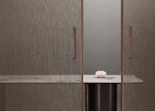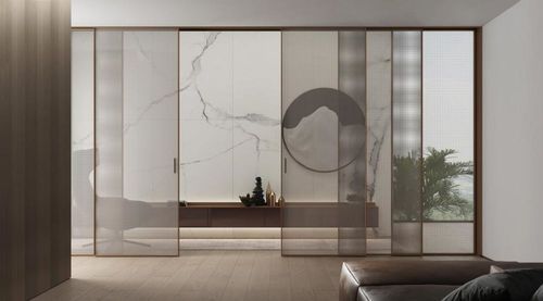 德立全景门双向推拉灵活便捷,极窄边框线条,细腻耀砂金夹丝图案融为一体,提升餐厅的颜值和功能。无底轨设贴心设计,自由走动不受局限,同时能保持地面干净整洁,不浓烈张扬的节奏感,藏匿于秋意的醇厚温柔和舒适之中。