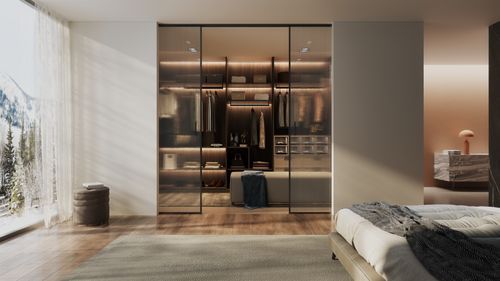 隐藏门设计让卧室与衣帽间边界感更小,空间整体视觉收窄更通透。雅黑色边框配与长虹玻璃简美不凡。暖光照耀下,布局和色调组合得都恰到好处。衣帽间饱满充盈的色调空间效果,流连置身于其中,挑选喜欢的秋装,轻松收获一天美好心情。