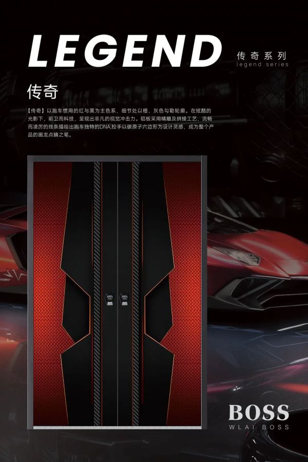 【传奇】 以d级跑车经典的红与黑为主色系,细节处以橙、灰色勾勒轮廓。在炫酷的光影下,前卫而科技,呈现出非凡的视觉冲击力。铝板采用精雕及拼接工艺,流畅而凌厉的线条描绘出d级跑车独特的DNA,拉手以碳原子六边形为设计灵感,成为整个产品的画龙点睛之笔。