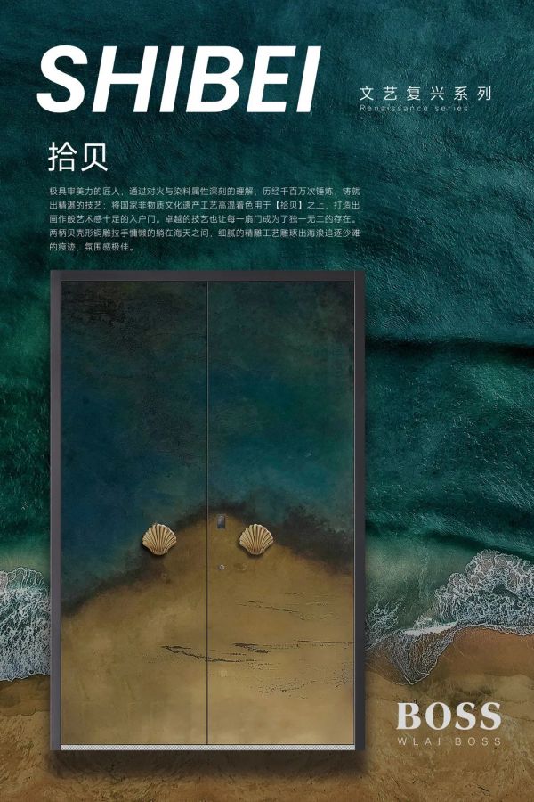 【拾贝】 表面采用非物质文化遗产——高温着色工艺于铜门之上。两柄贝壳形铜雕拉手慵懒的躺在海天之间,细腻的精雕工艺雕琢出海浪追逐沙滩的痕迹,氛围感极佳,宛如一件艺术品。匠人通过对火与染料属性的理解,巧妙的融合不同色彩,方寸之间,别有天地。