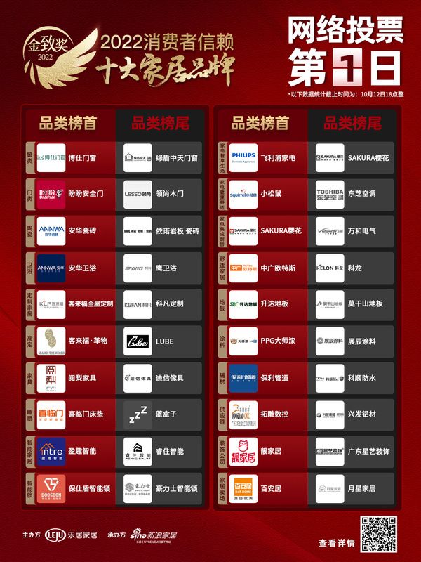 由乐居家居主办,新浪家居承办;CCTV《大国品牌》、家页、家居质量研究院、大国中居联合主办;全国工商联家具装饰业商会、中国建筑材料流通协会共同指导;乐腾商学院、家页智库、家居质量研究院提供研究支持。9月16日,第三届《寻找优质消费者品牌--2022消费者信赖十大家居品牌》正式启动。经过企业申报、候选品牌公示环节后,于10月12日正式进入投票环节。》》点击进入投票