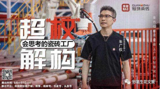 今年9月初,央视主持人朱广权走进冠珠瓷砖数字化示范工厂的纪录片《超“权”解构:会思考的瓷砖工厂》中,曾用有趣的顺口溜对工厂的数智化实力做了精准总结:“制造智能化,AI表现佳;管理数字化,效率一枝花;产品高端化,品质人人夸;产业绿色化,环保就看它”。而该视频发布,不到一天就获得了1660.3W的曝光量,2.26亿话题曝光,引发一波热议。