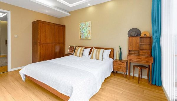 在更倾向于传统气息的卧室中,实木卧床、衣柜、床头柜、梳妆台,为整个空间打造出温意暖暖的私密氛围,丰富的层次感也将二人世界的温馨渲染而出。