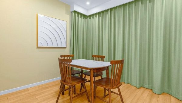 没有过多的修饰, 翠绿色窗帘下,一图、一桌、四椅,简单、自如、纯粹、利落,给这片空间营造出清爽的舒适感。一家人围桌在充裕的空间中或闲聊品茗、或享用美食、或娱乐嬉戏,惬意而从容,也让日子充实而幸福。