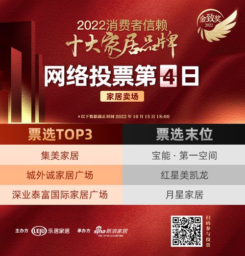 截止10月15日18时,网络票选第三日战报出炉,海量消费者积极踊跃参与投票,并将投票转发至好友、朋友圈为其信赖的品牌助力。数据显示,票选次日,家居卖场品类累计获得票数超14万。