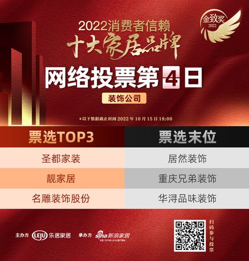 截止10月15日18时,网络票选第四日战报出炉,海量消费者积极踊跃参与投票,并将投票转发至好友、朋友圈为其信赖的品牌助力。数据显示,票选首日,装饰公司品类累计获得票数超20万。