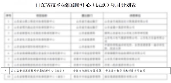 山东省智慧家庭技术标准创新中心落户海尔智家