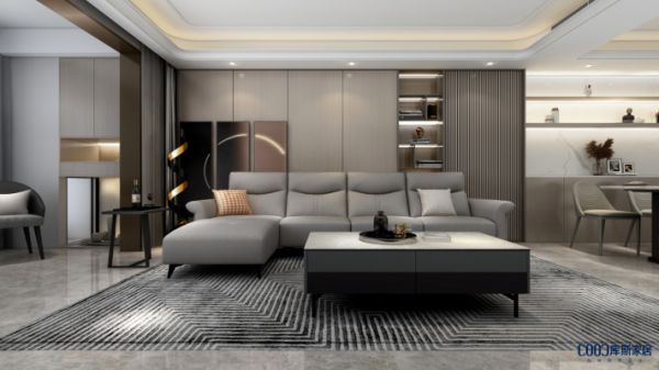 客厅采用了现代简约的设计手法,找寻现代人的生活步调。开放式的设计手法让客厅与阳台、餐厅融为一体,延展了整个视觉。