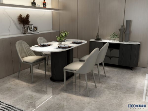 无论是走廊过道,都采用了自然原木色,旨在强调原生态空间的魅力。嵌入式的灯饰,梳理着空间的层次结构。黑白灰的色系呈现极致的高级感。黑色实木的餐桌凳和餐边柜营造时尚气息,搭配白色大理石纹理元素,时髦与朴素之间相互交叠、融合,碰撞出了多样的空间气质。