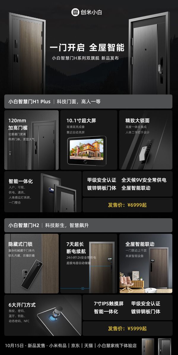 值得关注的是,10月15日,「小白智慧门H系列」两款旗舰新品正式发布,新款型H1plus 采用120mm加高门楣和10.1寸高清大屏,科技门面,高人一等;新款型H2主推隐藏式门锁设计,科技新生,智慧飙升,传承科技美学的外观设计,本次新品提供了更丰富的颜色尺寸选择,价格也更加亲民。