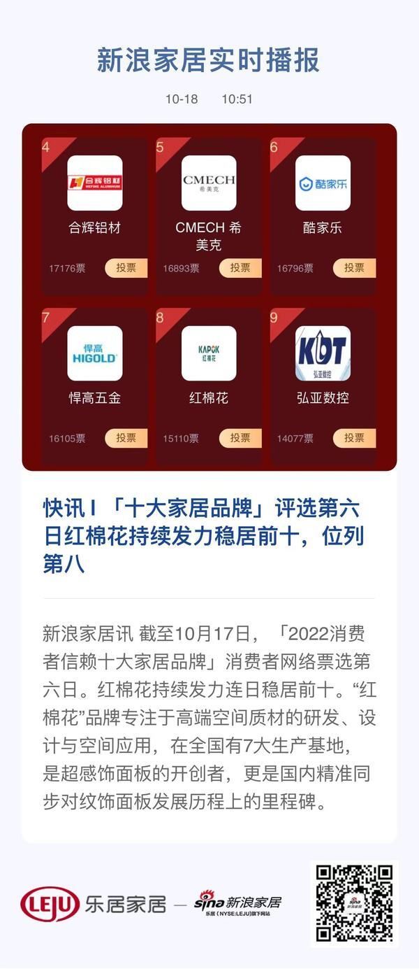 快讯 | 「十大家居品牌」评选第六日红棉花持续发力稳居前十,位列第八