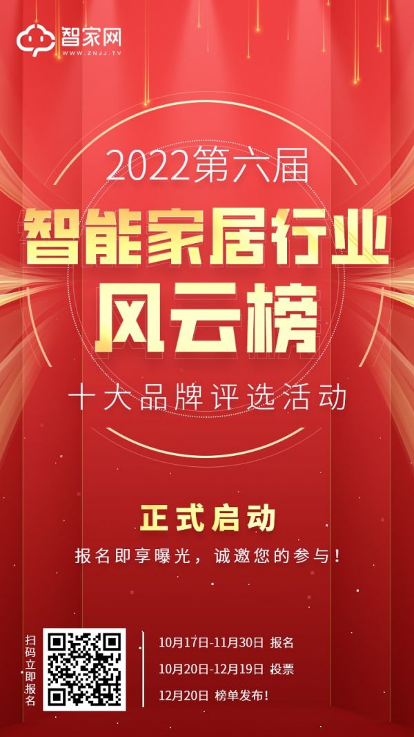 为表彰智能家居行业在过去一年的努力、加深消费者对智能家居的品牌认知、引导智能家居企业完善品牌宣传策略、推动智能家居行业高质量发展,在有关单位的指导下,智家网“2022第六届智能家居行业风云榜十大品牌评选”活动如约而至,我们诚邀业内品牌与广大消费者积极参与报名评选和投票,重塑品牌力量,见证行业蜕变!