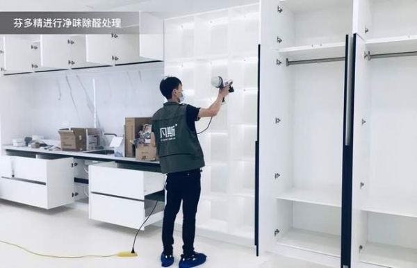 第一遍应选择芬多精进行净味除醛处理。对桌椅和柜子的外表面进行雾化喷涂,喷涂用量为10-15ml/㎡;而柜子内表面大多数都是密度板或者颗粒板,假如柜子内部没做封边,那么内部的甲醛等释放量是外面的5-10倍左右,所以芬多精的喷涂用量为40-50ml/㎡;而柜子内部的接缝处因为使用了大量胶水以及接缝两侧没有封边所以甲醛释放量最高,因此喷涂用量为60ml/㎡以上。