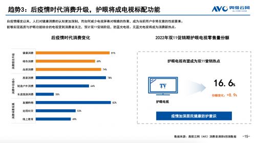 奥维云网《2022中国彩电市场“双11”预测报告》预测,今年双11促销期间,护眼电视零售量份额将达到16.6%,相比去年提升8.9%,成为电视市场的营销热点。报告观点基于当下消费者心理的变化预测而来。自疫情爆发以来,人们对健康消费的认知更加深刻,如何减少电视屏幕对眼睛的伤害,成为当前用户非常在意的性能要素。能够实现画质与护眼功能结合的电视受到消费者关注,防蓝光电视、无蓝光电视将成为双11家电消费新热点。