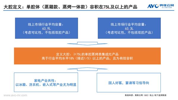 由于集成灶整体尺寸较为固定,因此在有限的空间下提升蒸烤箱的容量十分不易,每增加一升容量,都需要反复研究,以突破技术的掣肘。根据奥维云网(AVC)监测数据显示,单腔蒸烤类集成灶线上市场平均容积为63.9L,线下市场平均容积为63.3L,本次定义“大腔”为有效容积75L及以上单一腔体产品,容积超行业平均水平18%以上。因此,大腔蒸烤集成灶是指单腔容积在75L及以上的蒸烤类集成灶。