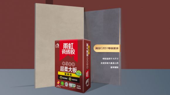 据了解,雨虹C500超柔大板瓷砖胶执行JC/T 547-2017《陶瓷砖胶粘剂》 C2ES1标准,最大可铺贴1.2m*2.4m的陶瓷大板。