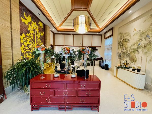 空间内可见日本织锦缎 枝上樱花金丝织屏风, 晚清陶瓷花器,琉璃灯 具,拿破仑时期鎏金烛 台与边柜,看似无意却 又精心地散落于各个角 落,交相辉映,细节更 是处处彰显东西方美学 的无间相融,精巧绝 伦。