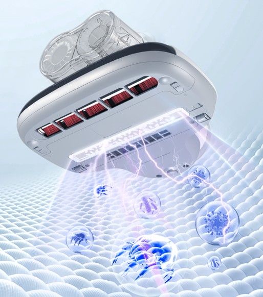 区别于传统除螨仪采用的普通拍打,美的研发团队颠覆传统除螨方式、创新采用专利高压电击技术,通过高压电离空气电离出的负离子破坏螨虫、细菌结构,实现螨虫死亡,再配合每分钟60000次的高频震动拍打+12000Pa的强劲吸力,将被褥等织物深层的螨虫清楚干净,实现深度清洁。经广东微生物检测中心检测报道显示,其除螨率高达99.9%。